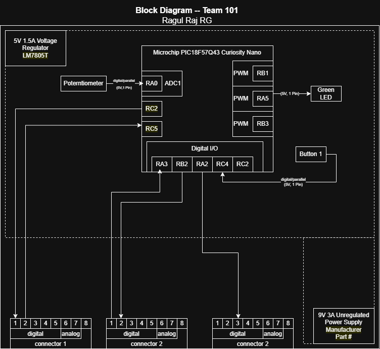 All components operate on a regulated 5V, 1.5A supply from an LM7805T voltage regulator, powered by a 9V, 3A unregulated source. The central controller is the Microchip PIC18F57Q43 Curiosity Nano, which manages logic, inputs, and outputs. The potentiometer connects to RA0 via ADC1, the green LED connect to RA5 using PWM, and the button connect to RC4 as digital inputs.