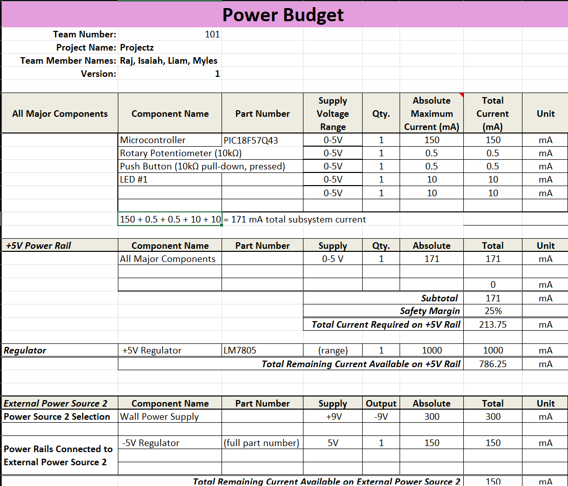 The power budget was created to estimate the total power consumption of the system, ensuring that the 5V regulator and power supply can safely support all components under normal and peak conditions. Each device’s voltage, current, and power were calculated and summed, with a 25% safety margin added to account for variations. This confirmed that the regulator’s 1500 mA capacity provides ample headroom. Heat dissipation was also evaluated, showing that a linear regulator (9→5V) would lose about 0.86 W, while a switching regulator would lose only 0.12 W. Overall, the power budget ensures reliability, efficiency, and proper power management in the circuit design.